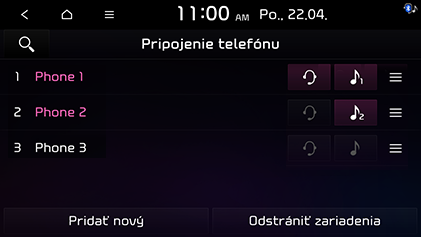 Stlačte zariadenie v otvorenom zozname zariadení Bluetooth. Ak chcete pripojiť ďalšie zariadenie, stlačte tlačidlo Pridať nový. Pokračujte krokmi 3 – 4 z časti „Ak neboli spárované žiadne telefóny“.