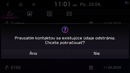 Bluetooth zariadenie je pripojené. Z mobilného telefónu sa stiahnu kontakty a zoznam volaní. Ak pripojenie zlyhá, jednotka zobrazí obrazovku s chybovým hlásením.