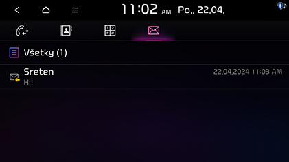 Stlačte tlačidlo Prijať vo vyskakovacom ozname alebo tlačidlo [s] na volante. Ak chcete telefonát odmietnuť, stlačte tlačidlo Odmietnuť vo vyskakovacom ozname alebo tlačidlo [j] na volante. Ak chcete na prichádzajúci hovor odoslať správu s odmietnutím, vo vyskakovacej správe vyberte možnosť Správy.