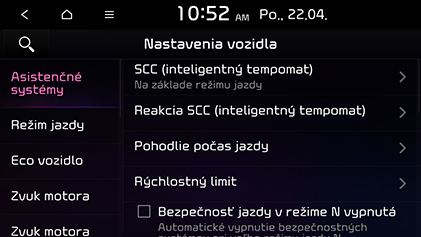 SCC (inteligentný tempomat): Nastavuje vlastnosti adaptívneho tempomatu SCC (Smart Cruise Control).