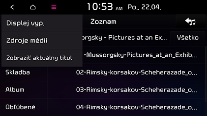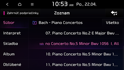 Kategóriu môžete usporiadať podľa možností Súbor, Interpret, Skladba, Album alebo Obľúbené.