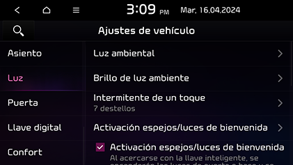 Activación espejos/luces de bienvenida: establece la situación en la que el espejo y la luz de bienvenida se activan.
