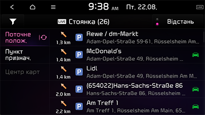 Поточне полож.: пошук парковок у реальному часі поблизу від поточного місцезнаходження автомобіля.