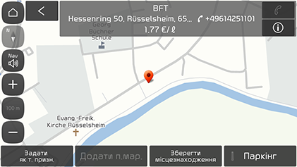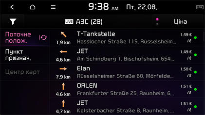 Поточне полож.: пошук заправних станцій у реальному часі поблизу від поточного місцезнаходження автомобіля.