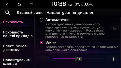 Автоматично (якщо встановлено): автоматичне перемикання яскравості відповідно до яскравості оточення в режим день або ніч (які можна налаштувати).