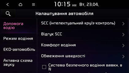 Натисніть SETUP > Автомобіль > Допомога водію.
