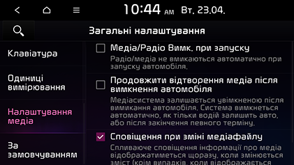 Продовжити відтворення медіа після вимкнення автомобіля: інформаційно-розважальна система продовжує працювати після вимикання автомобіля. Система автоматично вимикається після виходу водія або через установлений період часу.