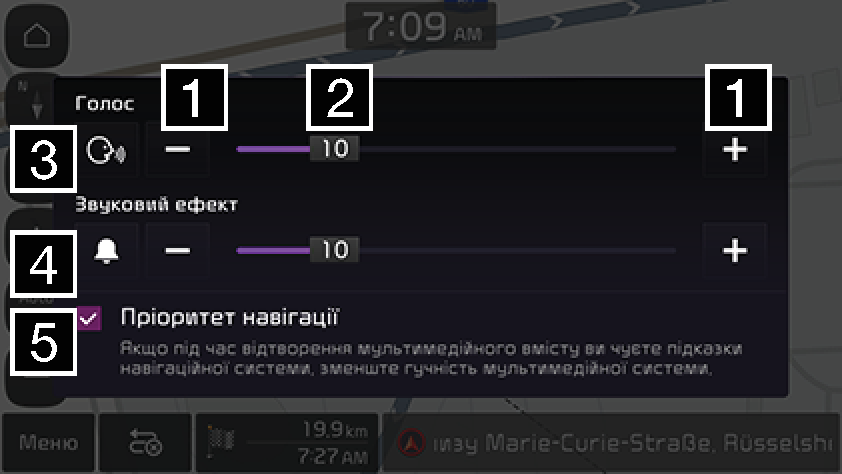 Якщо встановлена ця позначка, під час відтворення підказок навігаційної системи гучність всіх інших джерел звуку зменшується.