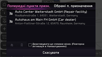 Якщо навігаційна система запускається без встановленого місця призначення, тоді місця, які ви відвідували раніше, та місця призначення у вибраному автоматично відображаються на спливаючому екрані. Для початку ведення по маршруту натисніть бажане місце призначення та маршрут на спливаючому екрані. Спливаючий екран доступний лише за відсутності встановленого місця призначення.