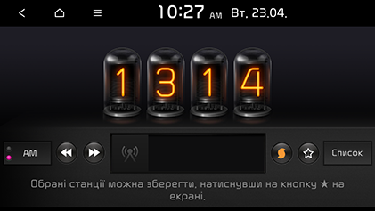 Натисніть DAB/FM або FM, щоб змінити діапазон частот на AM-радіо, якщо встановлено на DAB (якщо встановлено)/FM-радіо. Відображається станція, яку ви прослуховували останній раз.
