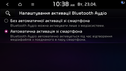 Ви можете налаштувати автоматичне вмикання режиму Bluetooth-аудіо, коли на підключеному телефоні відтворюється звук. Навіть якщо увімкнений інший режим або усі режими мультимедіа вимкнені, якщо ви вмикаєте відтворення Bluetooth-аудіо на телефоні, режим мультимедіа перемикається на Bluetooth-аудіо і ви можете керувати відтворенням на телефоні. Перед налаштуванням переконайтеся, що ваш телефон поєднаний та підключений до інформаційно-розважальної системи.