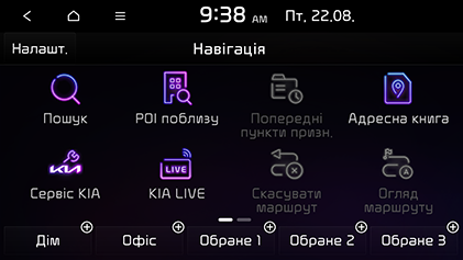 Ви можете встановити місце призначення, використовуючи швидку кнопку. Натисніть NAV і виберіть бажане місце кнопками Дім, Офіс, Обране 1, Обране 2, або Обране 3 у нижній частині екрана.