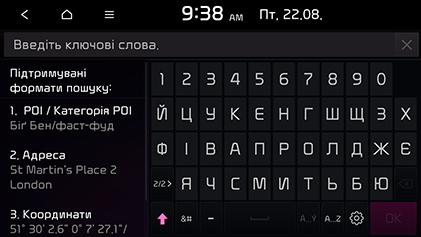 Уведіть ключове слово, таке як точка інтересу, категорія точки інтересу, адреса, координати, і натисніть OK.