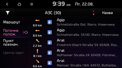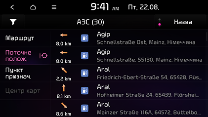Поточне полож.: пошук заправних станцій поблизу від поточного місцезнаходження автомобіля.