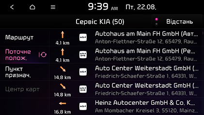 Маршрут: пошук сервісних центрів Kia вздовж поточного маршруту. Доступно лише за наявності встановленого місця призначення.