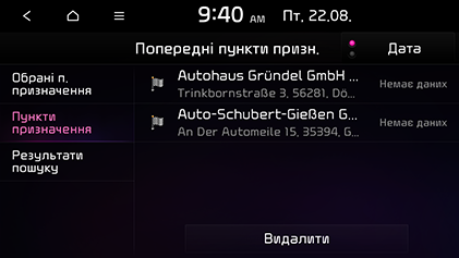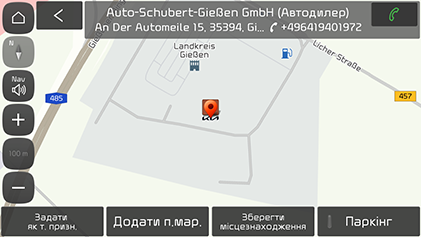 Пункт признач.: пошук сервісних центрів Kia поблизу від поточного місця призначення. Доступно лише за наявності встановленого місця призначення.