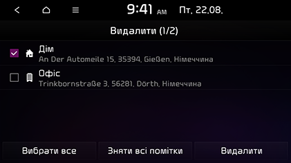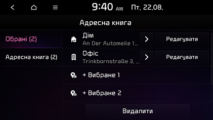 Місце призначення можна вибрати серед місць, збережених в меню Адресна книга. Щоб користуватися цією функцією більш ефективно, заздалегідь збережіть ті місця призначення, в які ви часто подорожуєте.