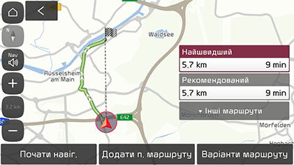 Виберіть бажаний маршрут і натисніть Почати навіг.. Ведення по маршруту запускається з урахуванням параметрів маршруту.