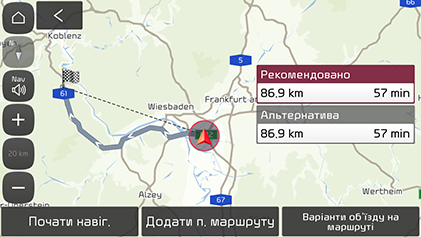 Дозволяє переглядати відстань до наступної точки керування по маршруту та напрямок повороту в цій точці. Також ви можете уникати певні вулиці враховуючи дорожні умови. Можна розрахувати альтернативний маршрут від місцезнаходження автомобіля до місця призначення.