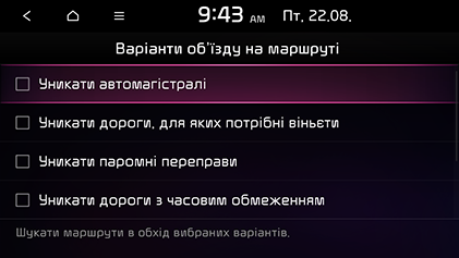 Натисніть Варіанти об’їзду на маршруті. Змініть бажані параметри уникання і натисніть [