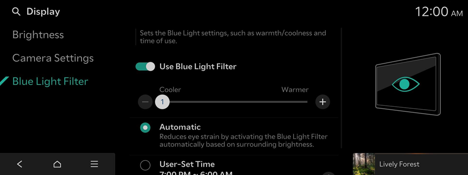 Sets the Blue Light settings, such as warmth/coolness and time of use.