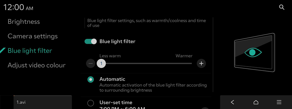 Blue light filter settings, such as warmth/coolness and time of use