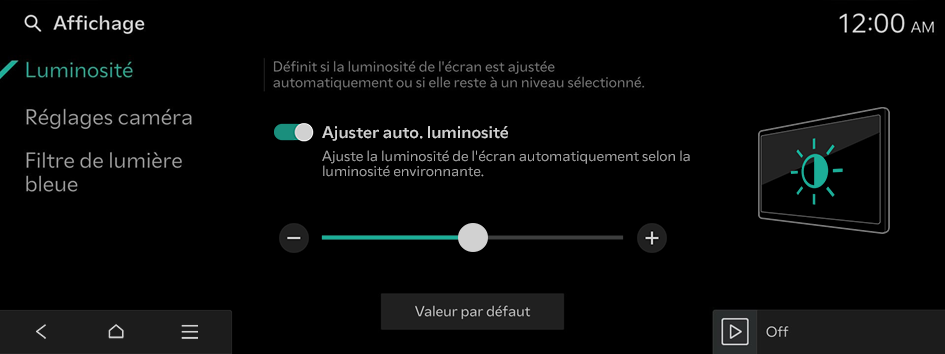 - Pour rétablir les valeurs par défaut de tous les paramètres de luminosité, appuyez sur Valeur par défaut.