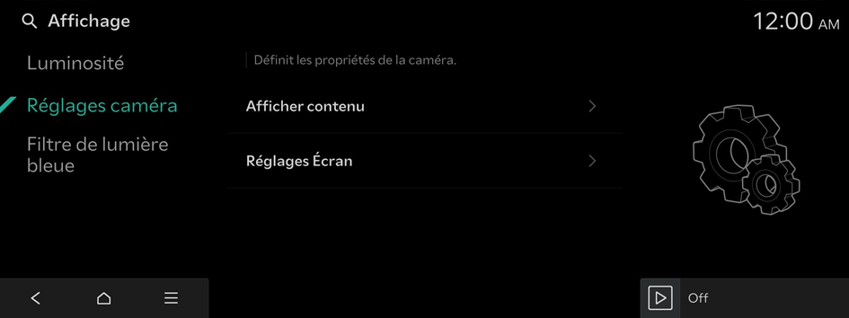 - • Étendre vue caméra arr. : garde la vue arrière à l'écran lors du passage de la position R à la position N/D. Passé une certaine vitesse, la vue arrière cesse de s'afficher. (Véhicules équipés d'un écran où la vue arrière peut être affichée uniquement)