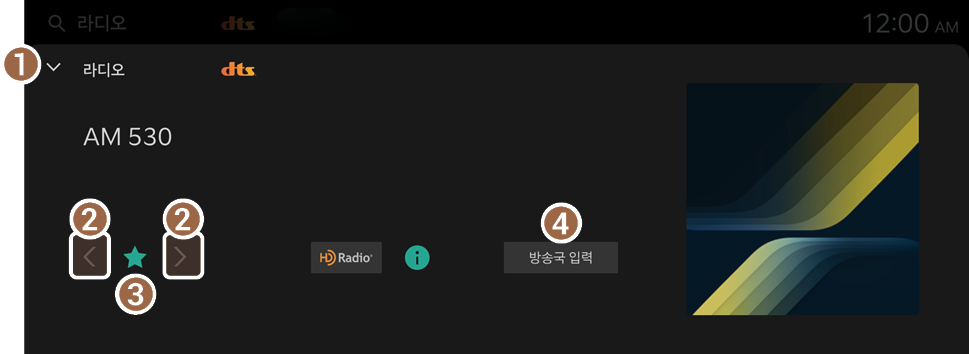- HD 모드에서는 HD 라디오 방송국 버튼이 라디오 화면 및 라디오 플레이어 화면에 표시됩니다. 사용 가능한 HD 라디오 방송국 버튼을 누르세요.