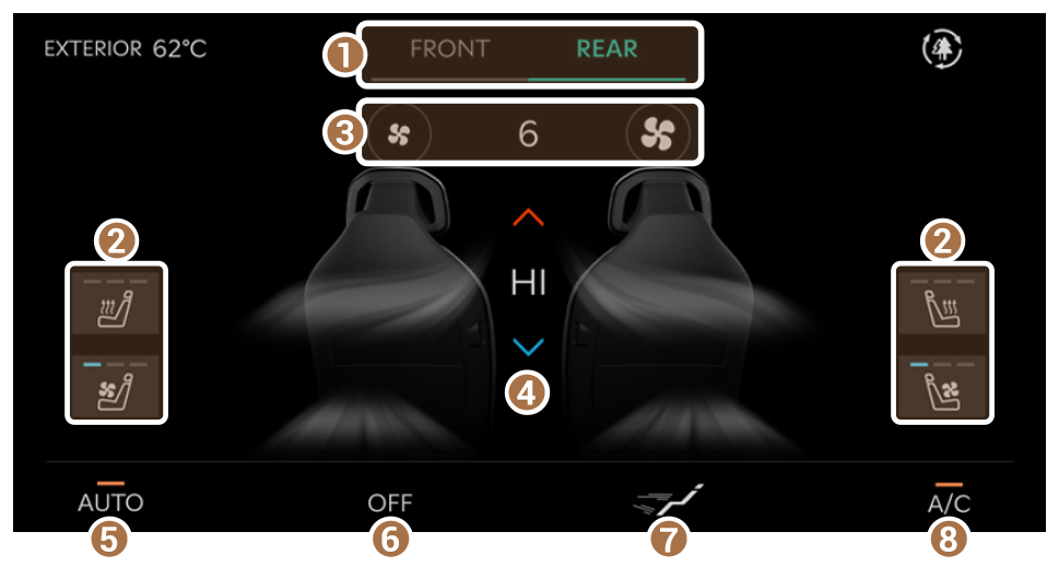 - Muestra la pantalla de configuración del control de climatización del asiento delantero o trasero.