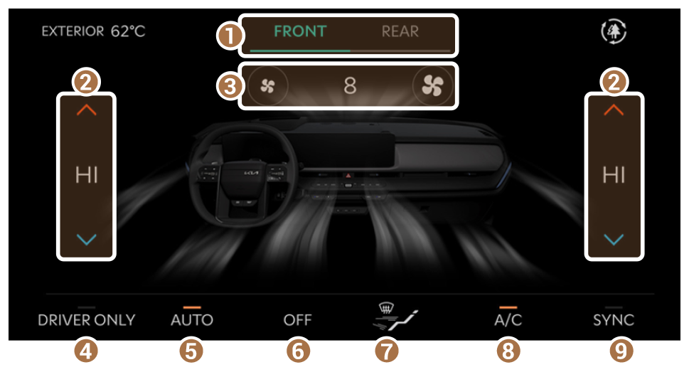 - Muestra la pantalla de configuración del control de climatización del asiento delantero o trasero.