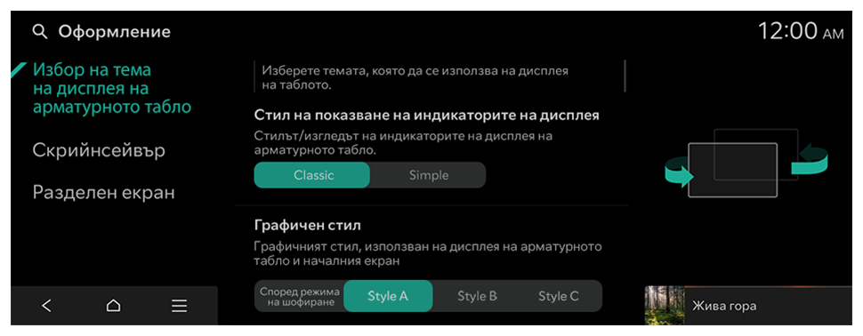 Избор на тема на дисплея на арматурното табло (ако е част от оборудването)