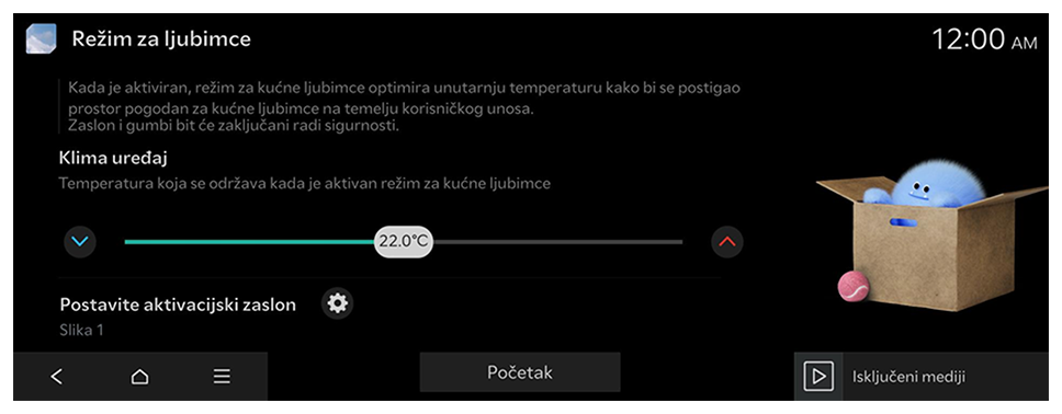 Kad morate kućnog ljubimca ostaviti dulje vrijeme u vozilu, način za kućne ljubimce optimizira temperaturu u vozilu da bi stvorio prostor prilagođen kućnim ljubimcima na temelju korisničkog unosa.