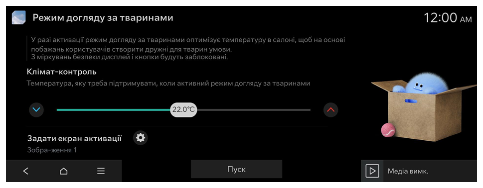 Якщо вам потрібно залишити домашнього улюбленця одного в салоні на короткий проміжок часу, режим домашньої тварини дає змогу забезпечити оптимальну температуру всередині автомобіля і створити безпечний для тварини простір, параметри якого визначені користувачем.