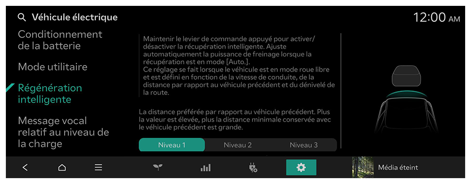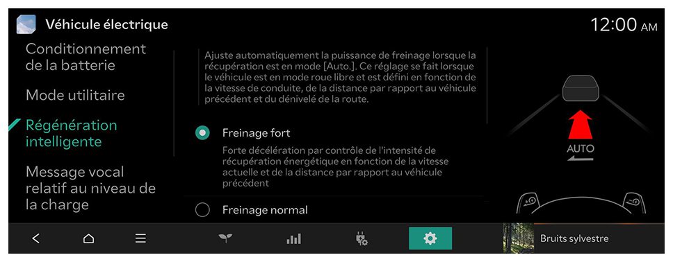 Ajuste automatiquement la puissance de freinage lorsque la récupération est en mode [Auto.]. Ces ajustements sont effectués lorsque le véhicule est en roue libre et sont basés sur la vitesse de conduite détectée, la distance par rapport au véhicule qui précède et la pente de la route.