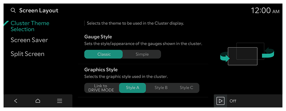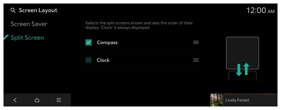 Selects the split screens shown and sets the order of their display. 'Clock' is always displayed.