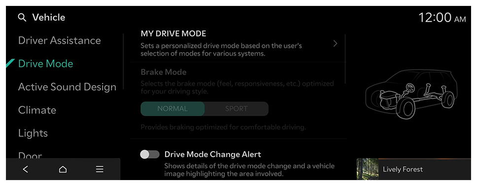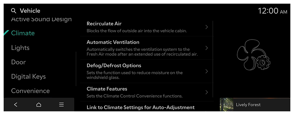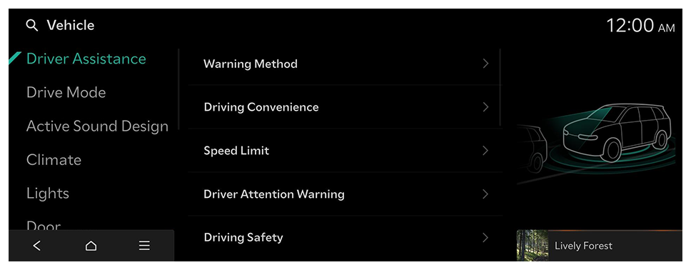- Available settings may differ depending on the vehicle model and specifications. Refer to the car owner's manual for further information about the features.