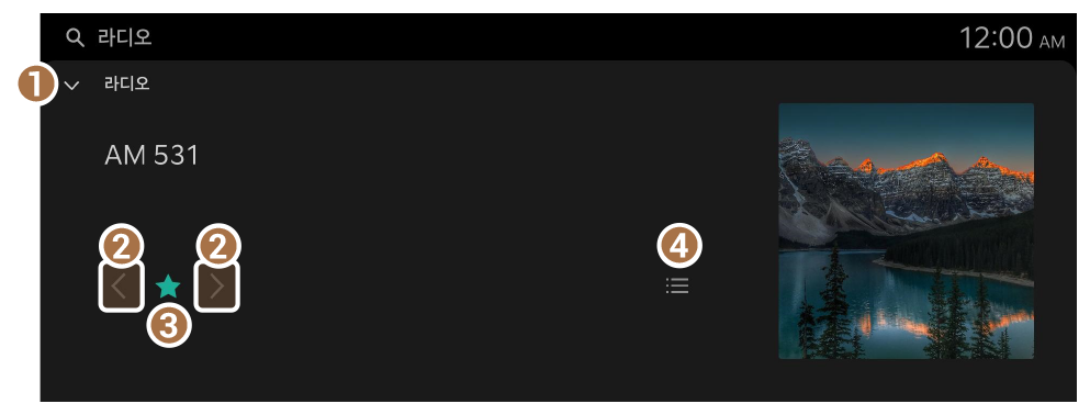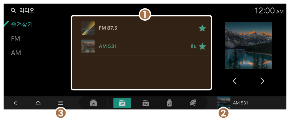 AM 라디오 채널을 검색하여 청취할 수 있습니다. 선호하는 채널을 즐겨찾기로 저장할 수 있습니다.