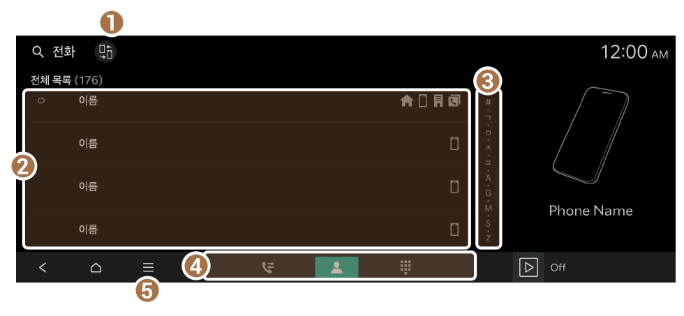 사용자의 휴대 전화에 저장된 연락처를 다운로드할 수 있습니다. 시스템 화면에서 연락처를 선택하여 전화를 걸 수 있습니다.