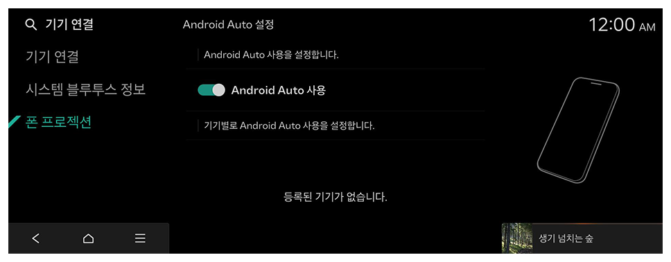 - 홈 화면에서 설정 ► 기기 연결 ► 폰 프로젝션 ► Android Auto 설정을 누른 후 Android Auto 사용을 누르세요.
