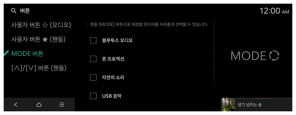 핸들 [MODE] 버튼으로 재생할 미디어를 자유롭게 선택할 수 있습니다. 재생 가능한 미디어에 한하여 동작합니다.