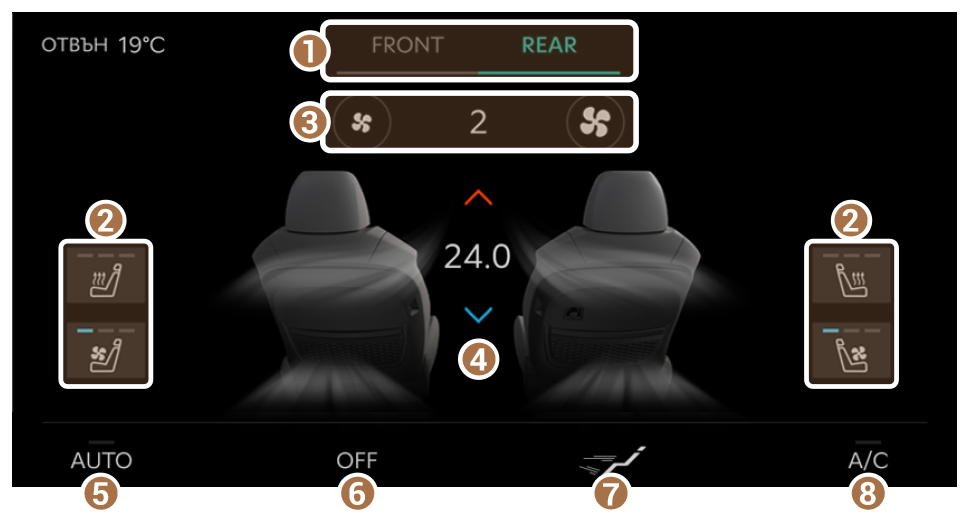 - Показване на екрана за настройки на климатроника за предните или задните седалки.