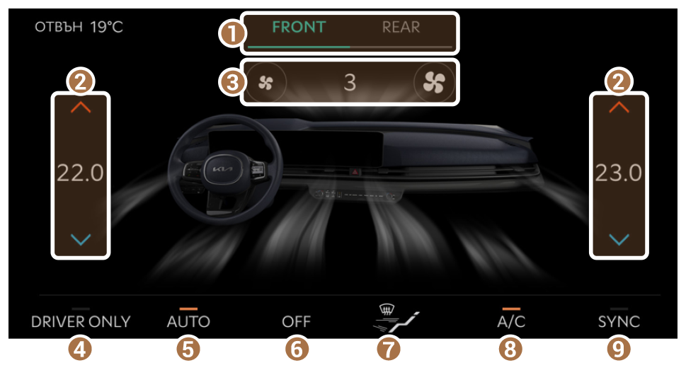 - Показване на екрана за настройки на климатроника за предните или задните седалки.