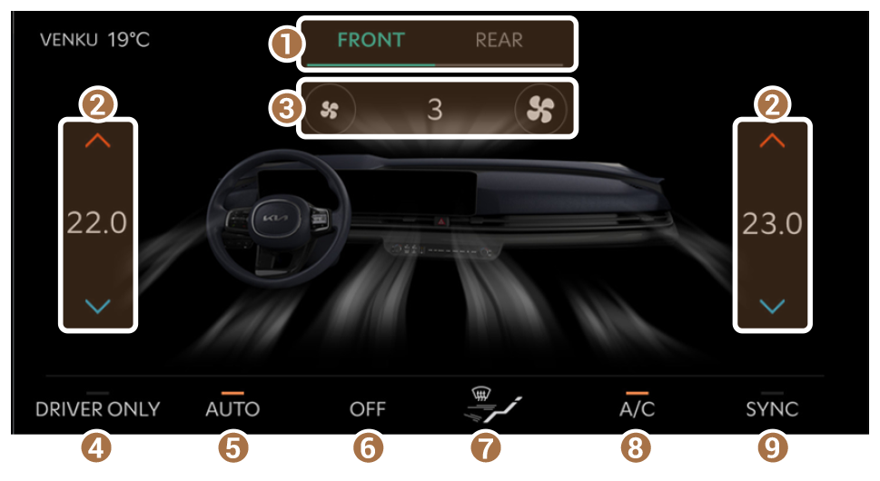 - Zobrazte obrazovku nastavení ovládání klimatizace předních nebo zadních sedadel.