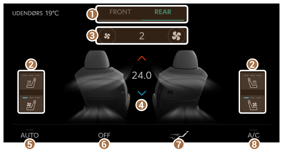- Vis indstillingsskærmen for klimakontrol ved for- eller bagsæde.