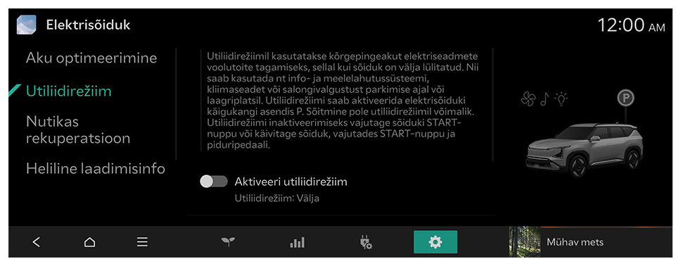 Utiliidirežiimil kasutatakse kõrgepingeakut elektriseadmete voolutoite tagamiseks, sellal kui sõiduk on välja lülitatud. Nii saab kasutada nt info- ja meelelahutussüsteemi, kliimaseadet või salongivalgustust parkimise ajal või laagriplatsil. Utiliidirežiimi saab aktiveerida elektrisõiduki käigukangi asendis P. Sõitmine pole utiliidirežiimil võimalik.