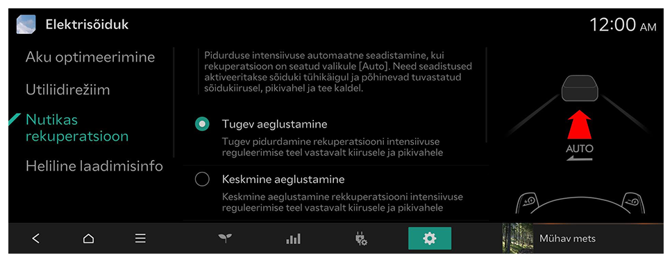 Pidurduse intensiivuse automaatne seadistamine, kui rekuperatsioon on seatud valikule [Auto]. Need seadistused aktiveeritakse sõiduki tühikäigul ja põhinevad tuvastatud sõidukiirusel, pikivahel ja tee kaldel.