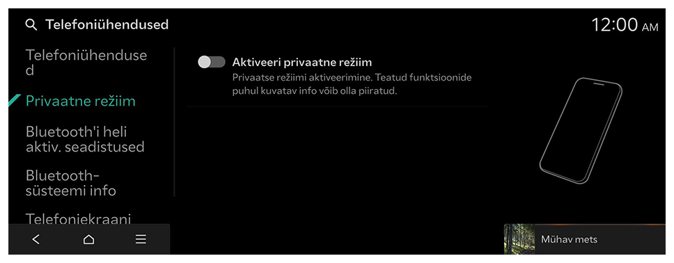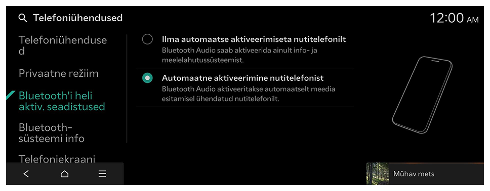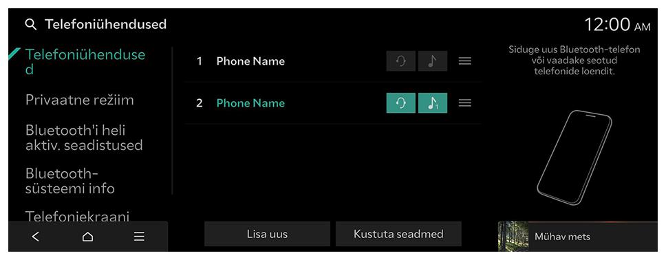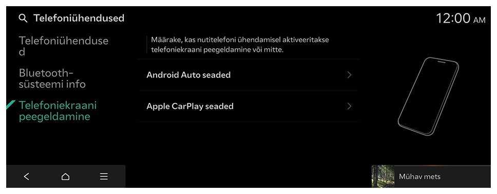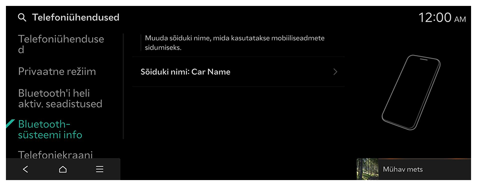 Te saate hallata Bluetoothi seadmeid või konfigureerida nende töösätteid. Samuti saate aktiveerida telefoniekraani peegeldamise, nii et pärast nutitelefoni ühendamist süsteemiga saate juhtida nutitelefoni rakendust süsteemi ekraanilt.