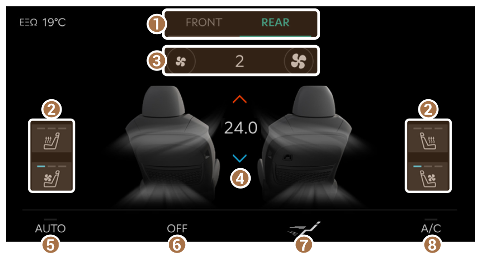 - Προβάλλετε την οθόνη ρυθμίσεων ελέγχου κλιματικών συνθηκών μπροστινών ή πίσω καθισμάτων.