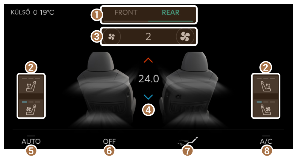 - Megjeleníti az elülső ülés vagy a hátsó ülés klímaberendezésének beállításait.
